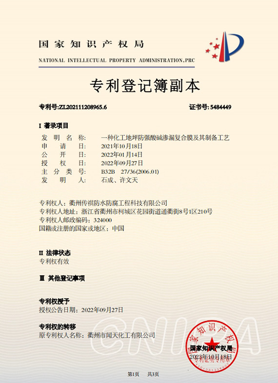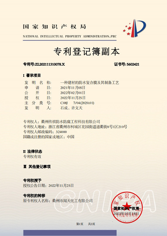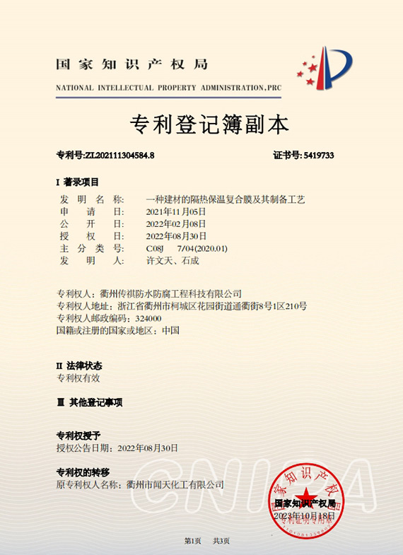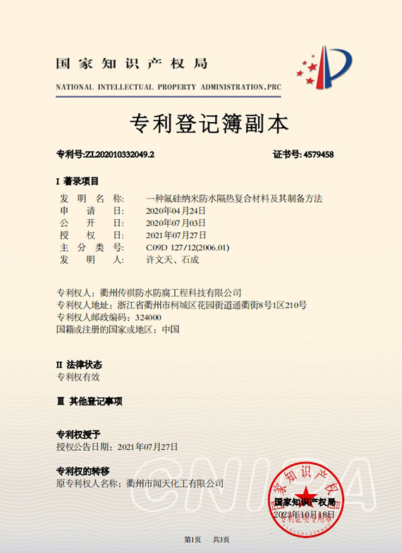 衢州傳祺新材料科技有限公司是衢州市聞天化工有限公司的下屬企業(yè);衢州市聞天化工有限公司成立于2003年,是國內(nèi)最早研發(fā)、生產(chǎn)氟碳涂料的企業(yè)之一。衢州傳祺新材料科技有限公司成立于2017年,公司專注于高分子氟材料的開發(fā)和含氟材料在防腐、防水領(lǐng)域的應(yīng)用。經(jīng)過6年的不懈努力,已獲得了化工和建筑領(lǐng)域六項(xiàng)國家發(fā)明專利授權(quán)和兩項(xiàng)新產(chǎn)品科技成果獎,參與了中國建筑材料流通協(xié)會《房屋修繕防水工程規(guī)范》標(biāo)準(zhǔn)的編制工作,中建協(xié)涂裝委員會浙西工作站設(shè)立在我公司。